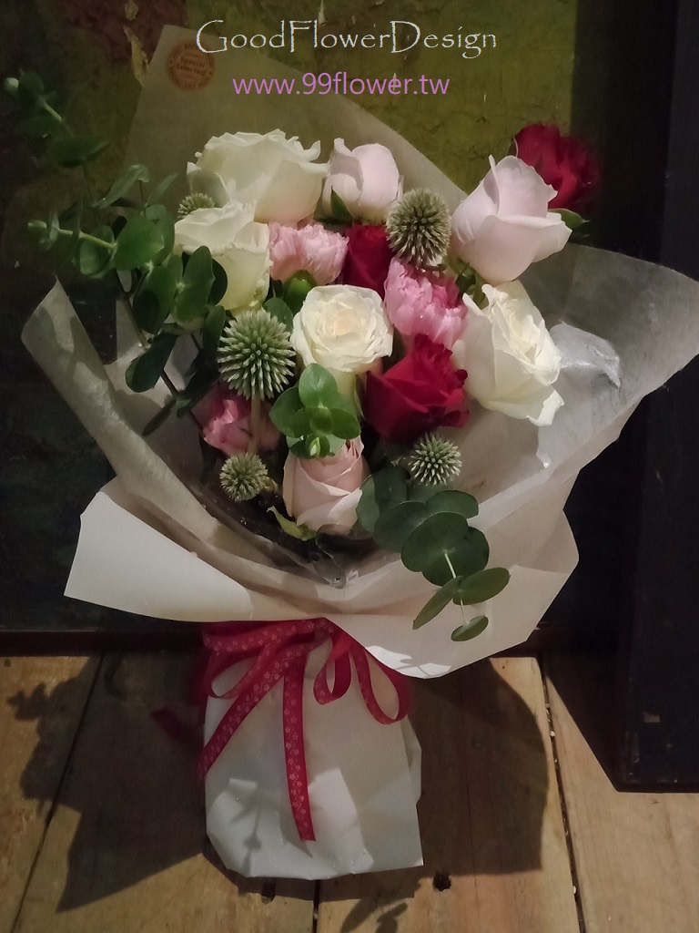 高約60公分不同顏色的進口A級玫瑰搭配尤加利和配花情人節時花價漲幅劇烈波動,玫瑰會使用台灣產地